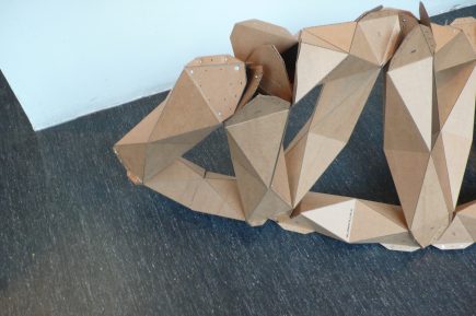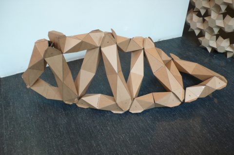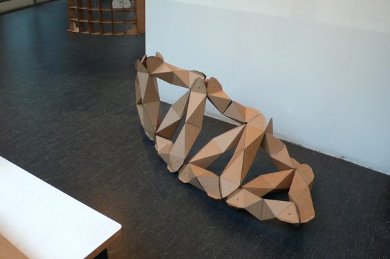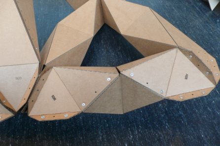 To find a simple, and elegant, sufficient module, performance model was developed mainly in physics, numerical tool for better sizing of elements according to the scale of application of the method. The required accuracy of fit between the elements can be achieved only by laser-cutting. This manufacturing method suggesting a cardboard building as well as in wood or metal, only sheets of material are sufficient. 3D product design itself patterns cutting required for installation. The proposal is a good example of an approach to design and manufacture through a search on the fold as structural potential.