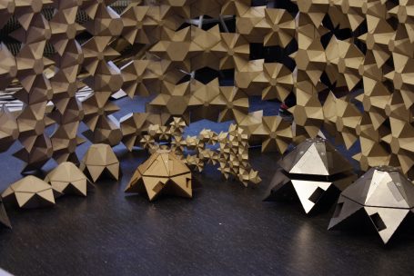 Thereby, while conceptualizing on Digital Project, we chose to concentrate on the study of regular polyhedrons, and more particularly on icosahedrons and tetrahedrons. By considering an hexagon of side length x on which are “fixed” six tetrahedrons of the same side length, we obtain two rings, changing according to two parameters: the first tetrahedrons ring position on the hexagon, guided by a “cursor” point, and the second tetrahedrons ring position in relation to the first one, defined by an angle α.