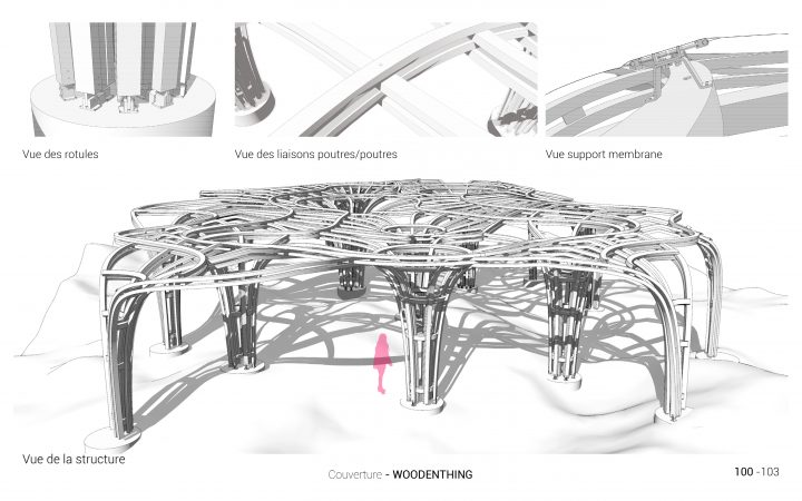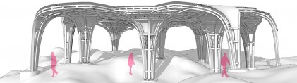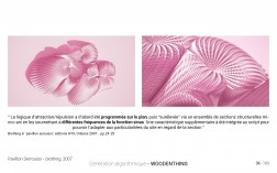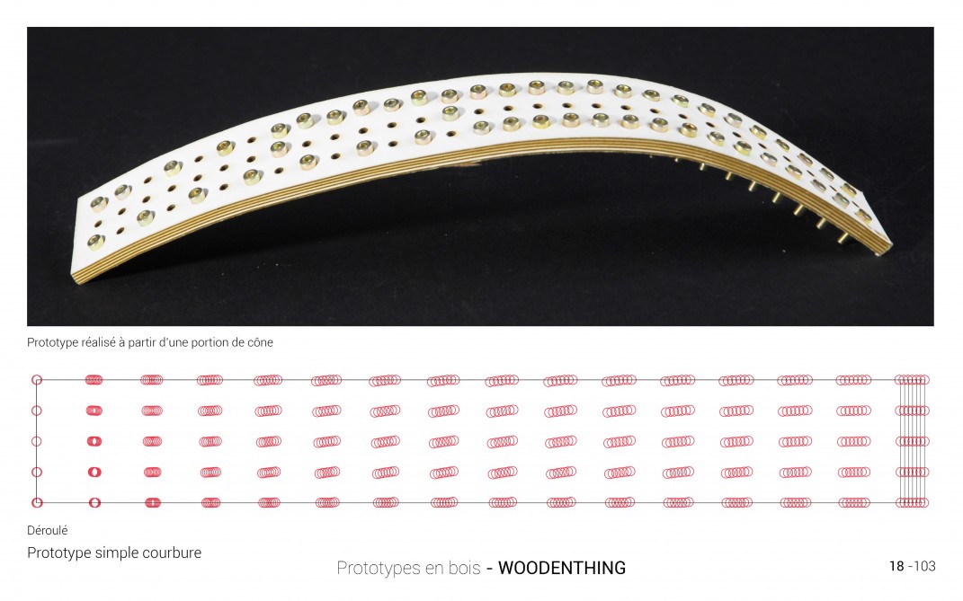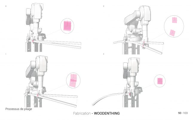 L’architecture générative ne se crée plus par décisions explicites (le trait) mais par description d’un comportement informé (le code). Le concepteur définit des objectifs et une méthode pour les atteindre. Dans une pratique architecturale contemporaine, ces objectifs sont souvent d’ordre esthétique ou programmatique, les problèmes liés à la fabrication étant encore traités comme un post-process. Notre position, par la définition et l’expérimentation préalable d’une méthode de pliage du bois robotisé, est d’intégrer la fabrication et ses contraintes (courbure et portée maximales, traitement des joints, etc.) dès les premières étapes de conception, le but étant d’éprouver un continuum file2factory total, de la conception digitale à la fabrication robotisée.